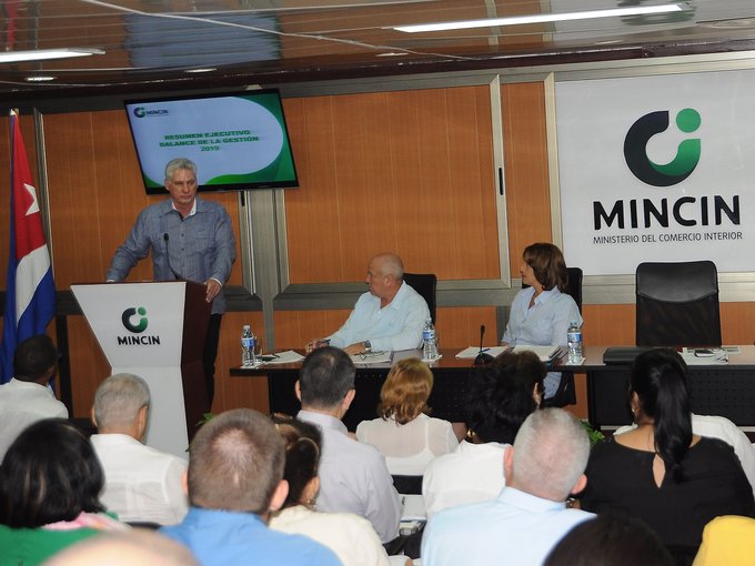 El presidente cubano destacó el trabajo desarrollado por el Ministerio de Comercio Interior, en el ordenamiento de la actividad de comercio y gastronomía, en su labor rectora, y la relación con otros ministerios, la garantía de la canasta básica y de los programas sociales.