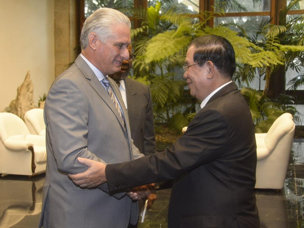 El Presidente @DiazCanelB recibe en el Palacio de la Revolución al Primer Ministro del Reino de Cambodia, Honorable Señor, Samdech Techo Hun Sen.#Cuba y #Cambodia establecieron relaciones diplomáticas el 15 de abril de 1960. pic.twitter.com/sDx0OcpnaX