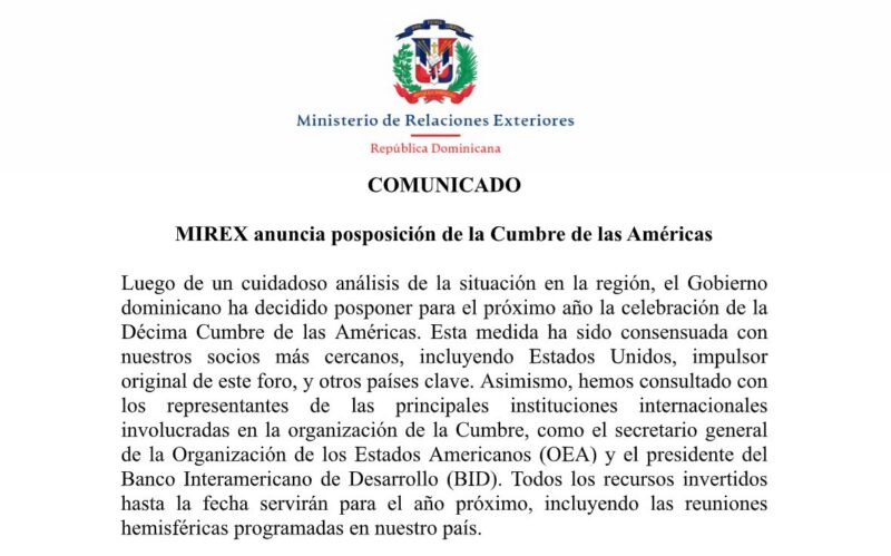 Luego de un cuidadoso análisis de la situación en la región, el Gobierno dominicano ha decidido posponer para el próximo año la celebración de la X Cumbre de las Américas, medida que ha sido consensuada con nuestros socios más cercanos, incluyendo Estados Unidos, precisó en la nota.