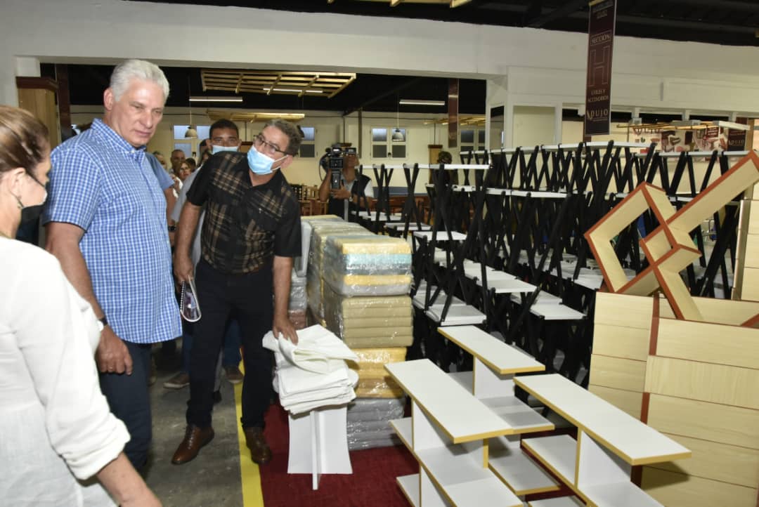 En medio del Vedado capitalino cobra vida un nuevo proyecto de la industria cubana del mueble, como parte del cual se restauró una nave-almacén que estaba en desuso. Allí llegó esta mañana el presidente Díaz-Canel.