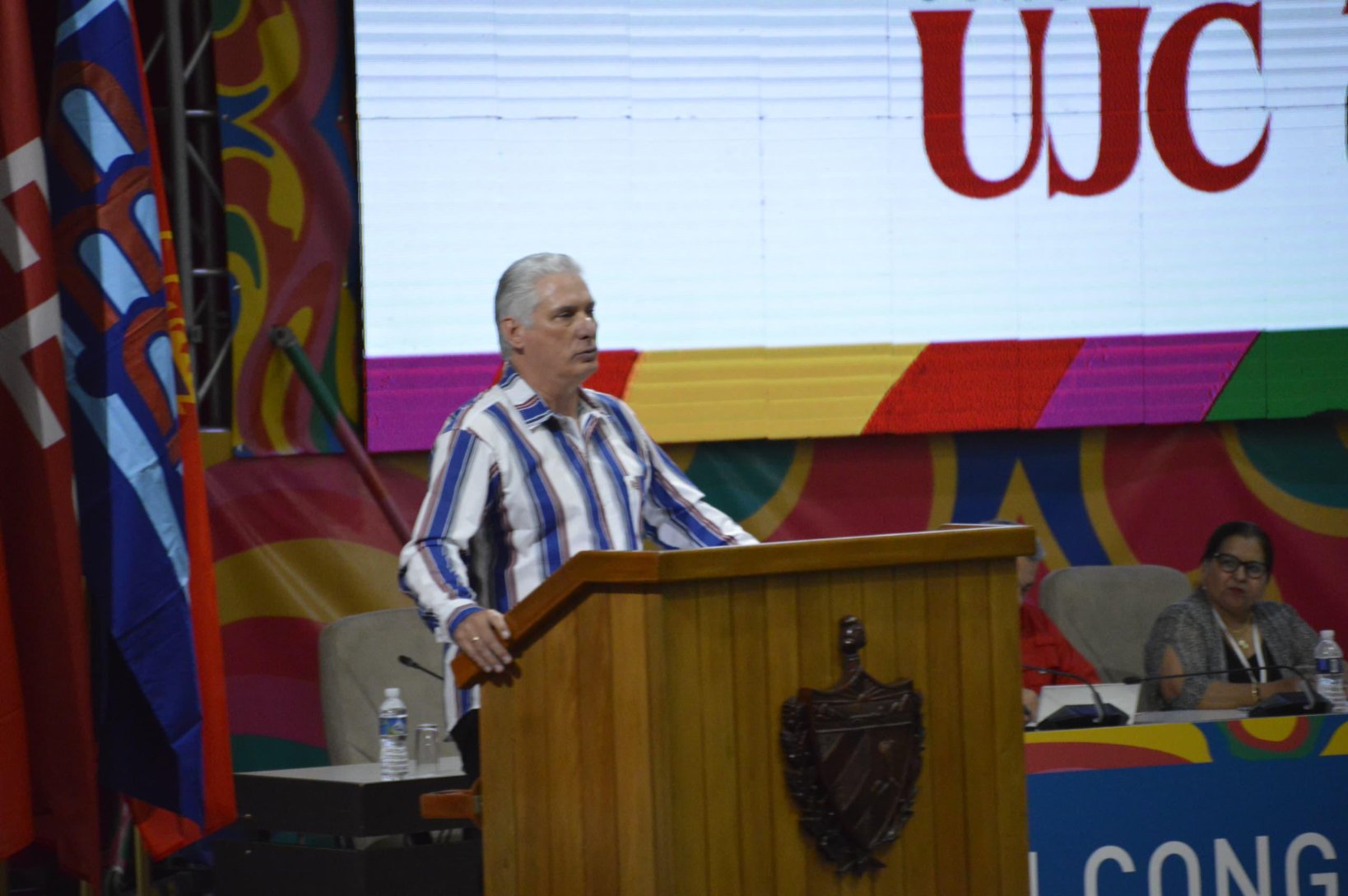 Denunció el bloqueo genocida y reconoció que el gran mérito de la juventud cubana que vive, estudia y trabaja aquí, es que saltan por encima de los problemas y salen todos los días a pelear por hacer de Cuba un país mejor.